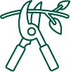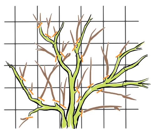 - En coupant à ras les branches orientées vers le centre de l ’arbuste et celles qui se touchent.